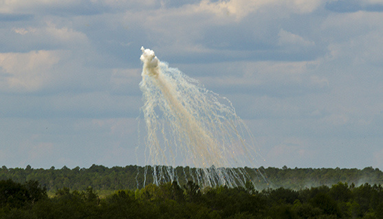 A white phosphorous round busts far over the earth as artillerymen create a screen during an exercise at Fort Stewart, Georgia, on May 22, 2016.