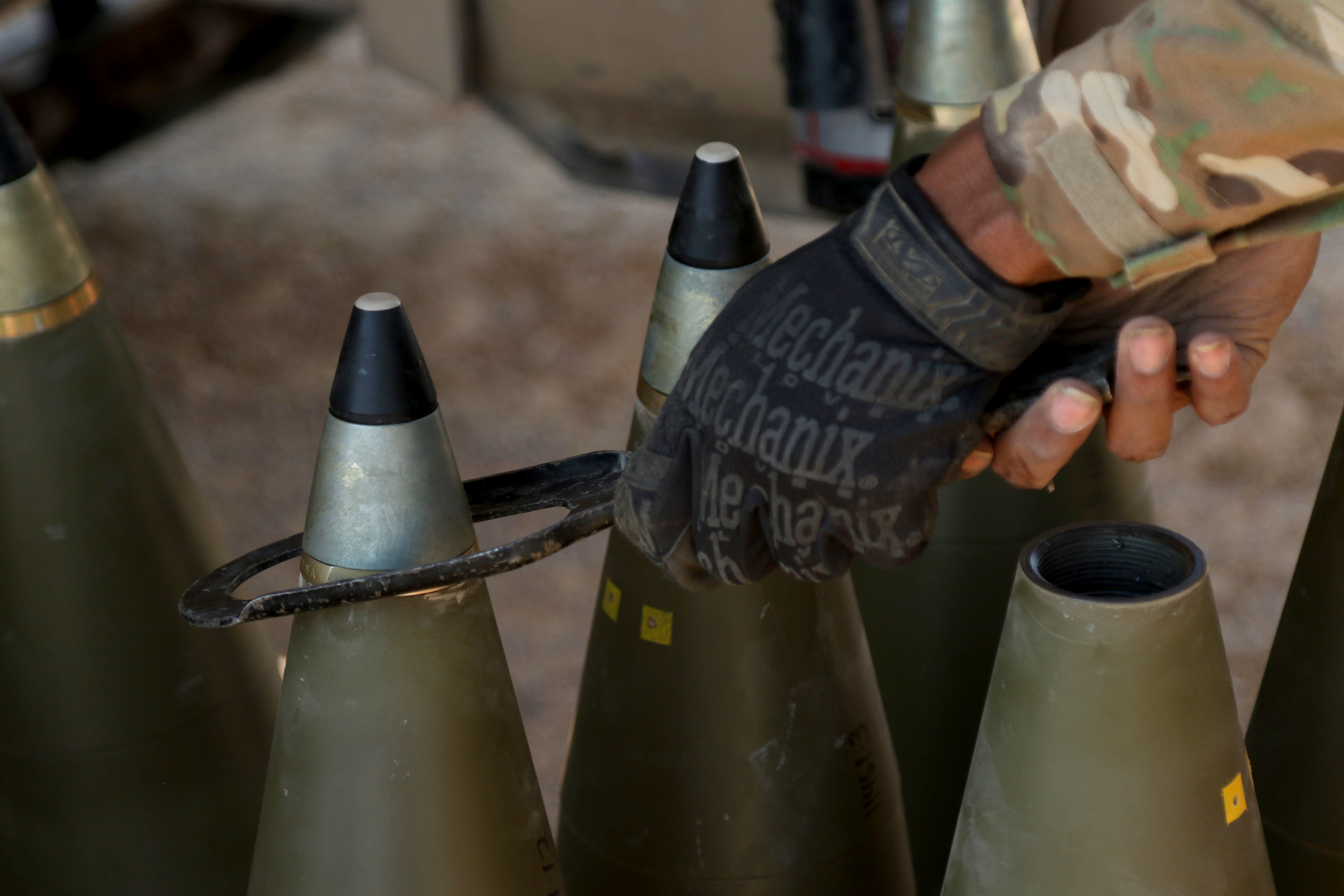 An artillery crewman from Alpha Battery, 2nd Battalion, 114th Field Artillery Regiment, 155th Armored Brigade Combat Team, Task Force Spartan, uses a tool to secure the fuse to the 155mm round during a combined arms live fire exercise on September 11, 2018.