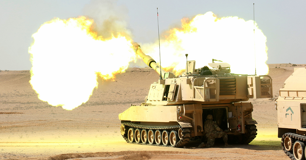 An M109 Paladin fires a 155mm high-explosive round during a combined armslive fires exercise on September 9, 2018.