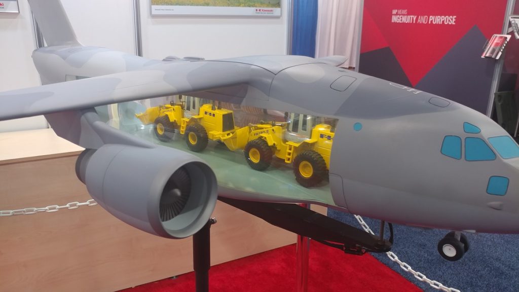 This is known as the Kawasaki C-2, and according to the Kawasaki web site, it’s equipped with a host of new systems. A handout distributed at Kawasaki’s booth at the AirSpaceCyber expo held at the Gaylord Convention Center in National Harbor Maryland noted that the C-2 is able to carry 66,000 pounds, has a range of 3,100 nautical miles without aerial refueling while carrying its maximum payload, and can cruise at Mach .8, or 529 knots.