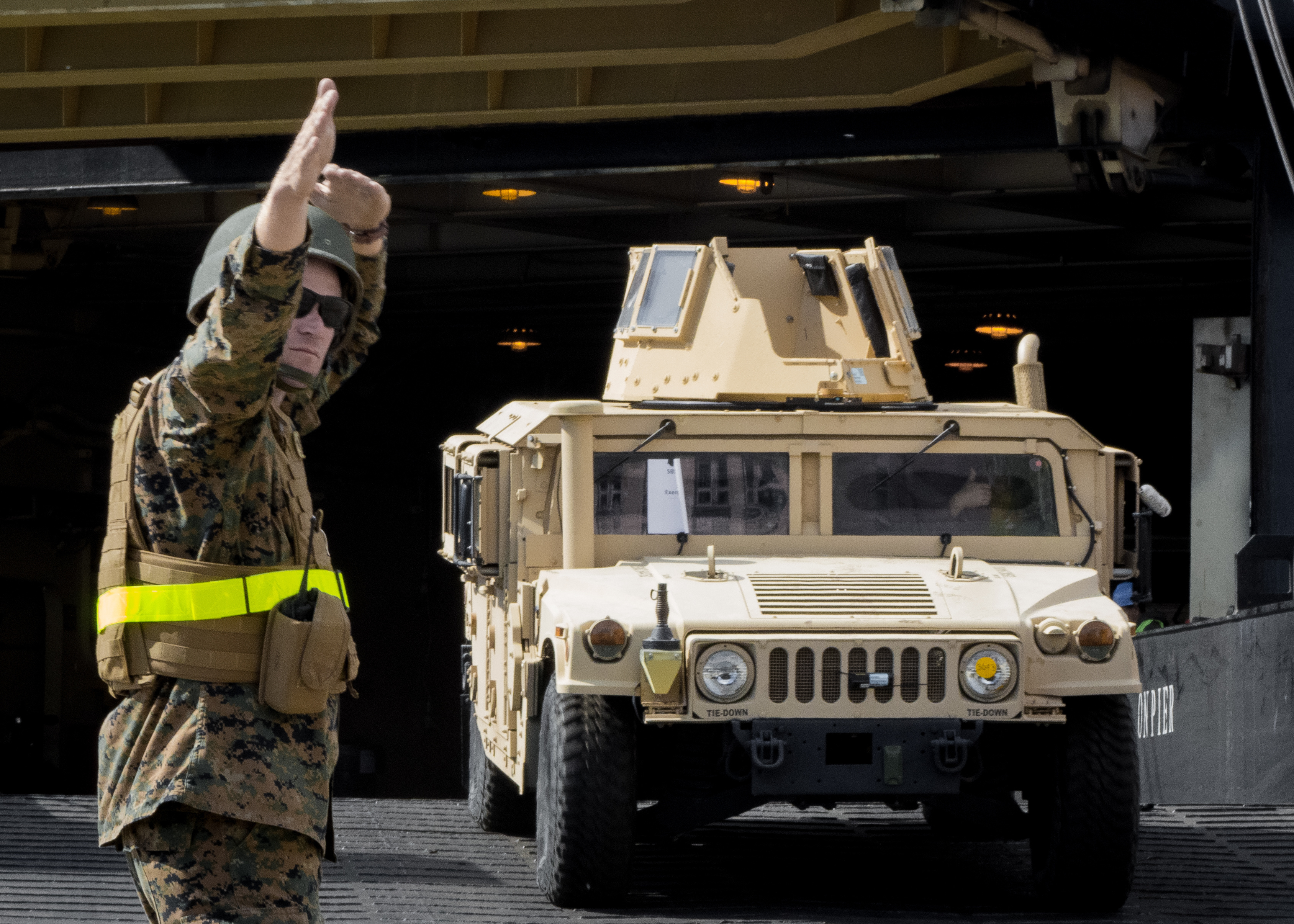 A HMMWV offloads from a maritime prepositioning ship during Saber Strike 2018. These ships carry gear and supplies to support Marine units.