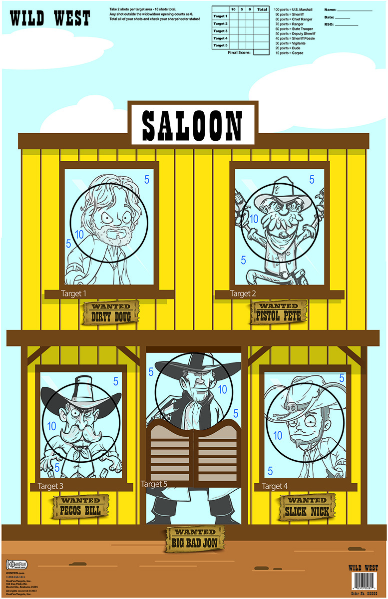 And today’s a good day for it since you’re enjoying yourself, taking shots at outlaws from the Wild West. Pecos Bill, Dirty Doug, Pistol Pete, Slick Nick, and Big Bad Jon have had this coming for some time, strutting around the saloon like they own the place.