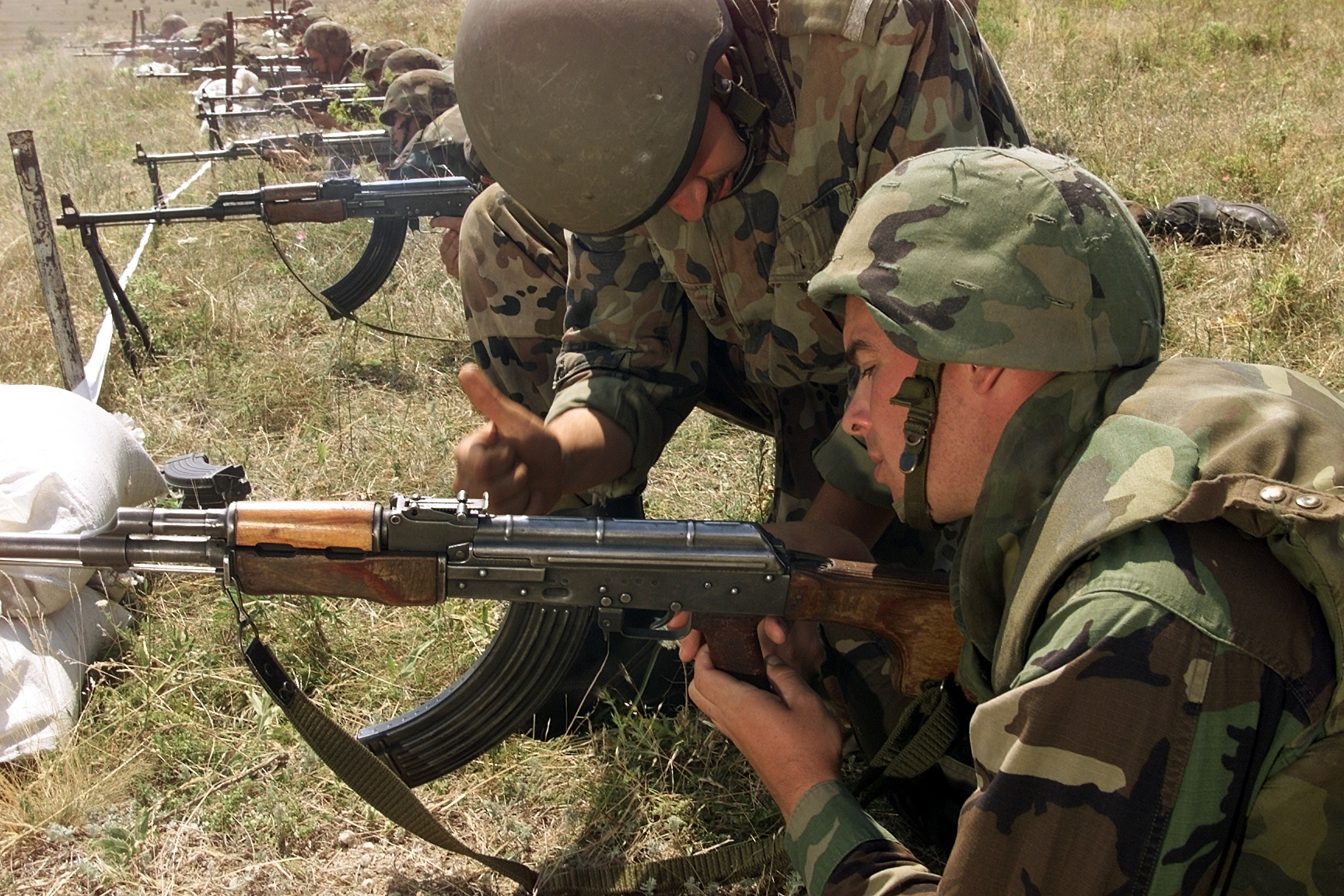 U.S. Marine Cpl. Chris P. Duane (right) receives assistance from an Romanian soldier in clearing a Russian RPK squad automatic rifle during the weapons familiarization phase of Exercise Rescue Eagle 2000 at Babadag Range, Romania, on July 15, 2000.