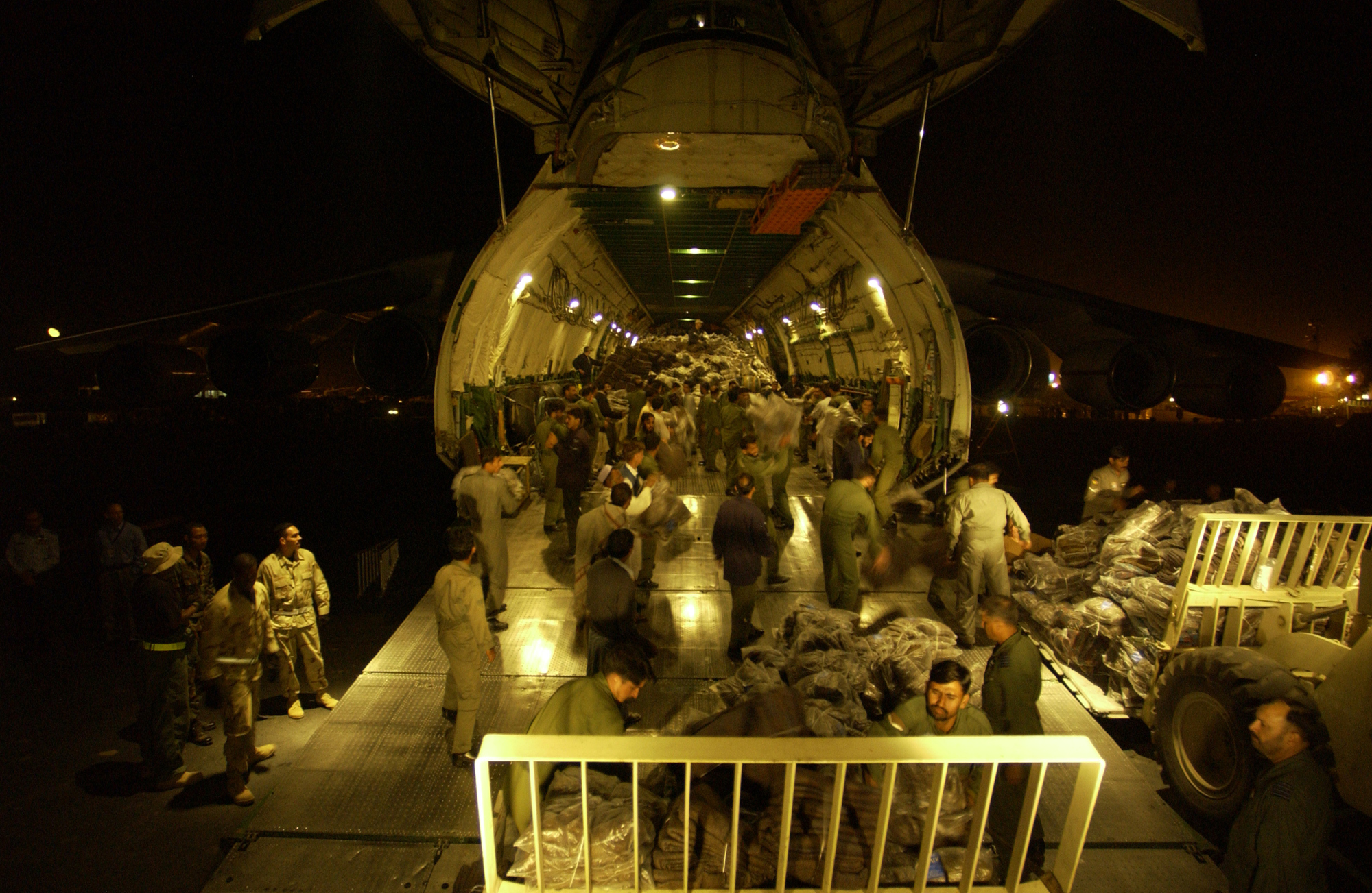 United States Air Force Airman, Pakistani soldiiers, and Ukrainian aid workers offload a Russian AN-225 at Chaklala Air Base, Pakistan, Oct. 21, 2005. (USAF photo by Tech. Sgt Jeromy K. Cross)