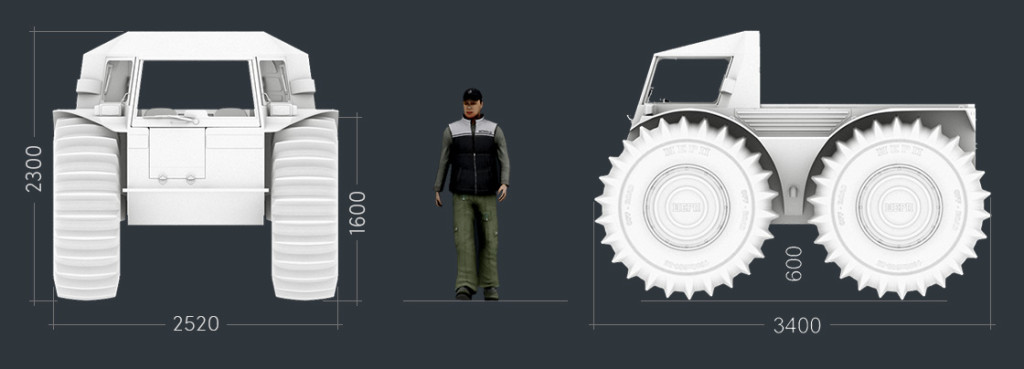 The Sherp all-terrain Russian adventure-mobile looks like a Tonka truck. The two-passenger ATV with 63-inch wheels is deceiving in that it appears much larger than it actually is from far away.