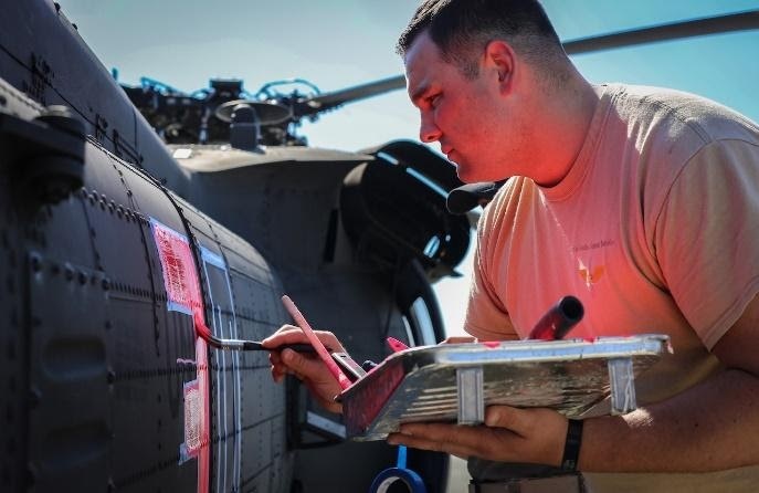 Spc. Nicholas Ehrenheim of the 351st Aviation Support Battalion applies pink paint to a Black Hawk (Army National Guard)