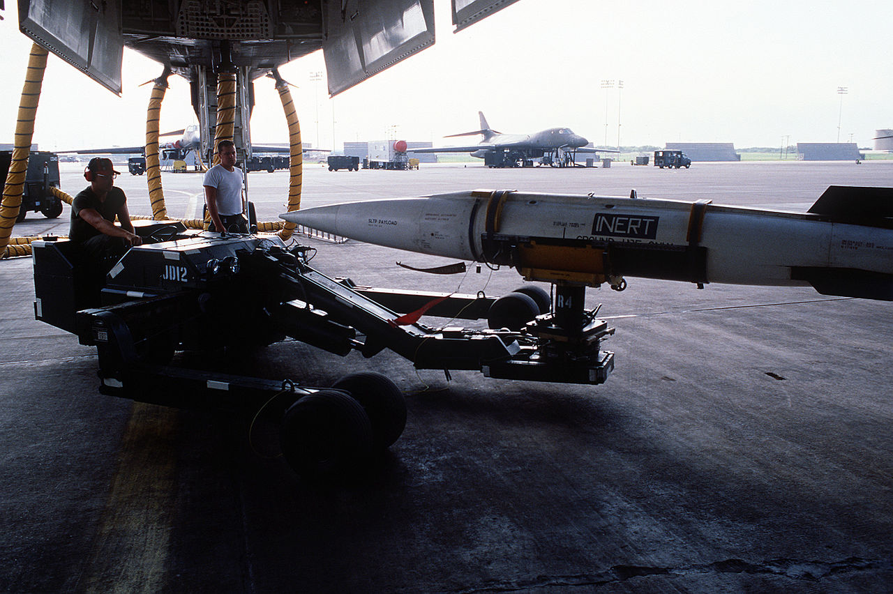 A training version of the AGM-69 Short-Range Attack Missile is loaded onto a B-1B Lancer. The B-1 could carry two dozen of these missiles.