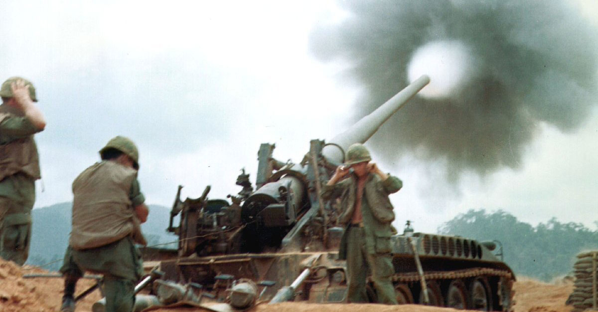 A M107 self-propelled gun reaches out to touch the enemy during a fire mission in South Vietnam.
