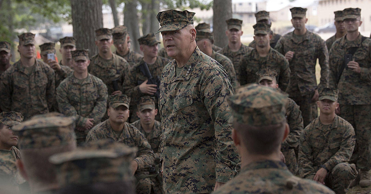 Marine Corps Commandant Gen. Robert Neller addresses Marines wearing the woodland MARPAT cammie uniform. (Photo from U.S. Marine Corps)