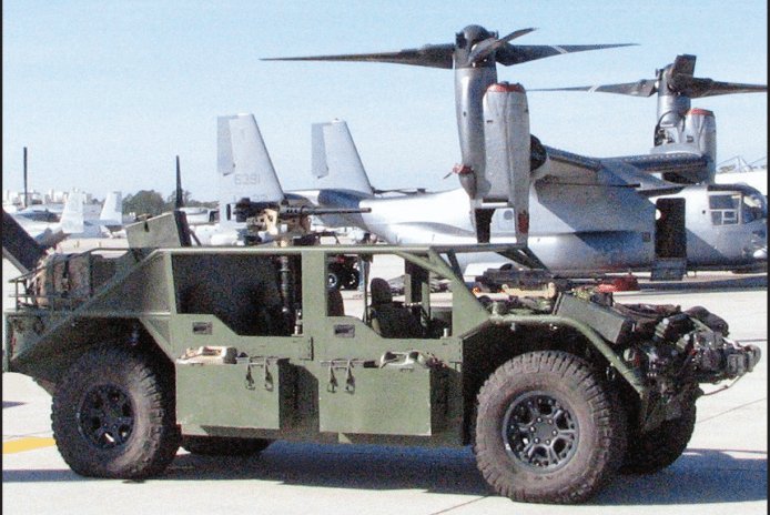 Its rear doors also hold swing mounts for 7.62mm machine guns or 5.56mm machine guns. It can be transported inside a V-22, CH-47, C-130, or C-17.