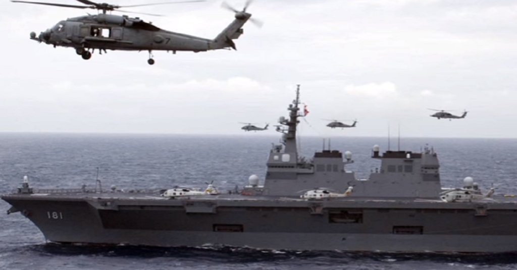 The Japan Maritime Self-Defense Force helicopter destroyer JS Hyuga (DDH-181) underway in the Pacific Ocean as U.S. Navy Sea Hawk helicopters hover nearby. (Photo: U.S. Navy)
