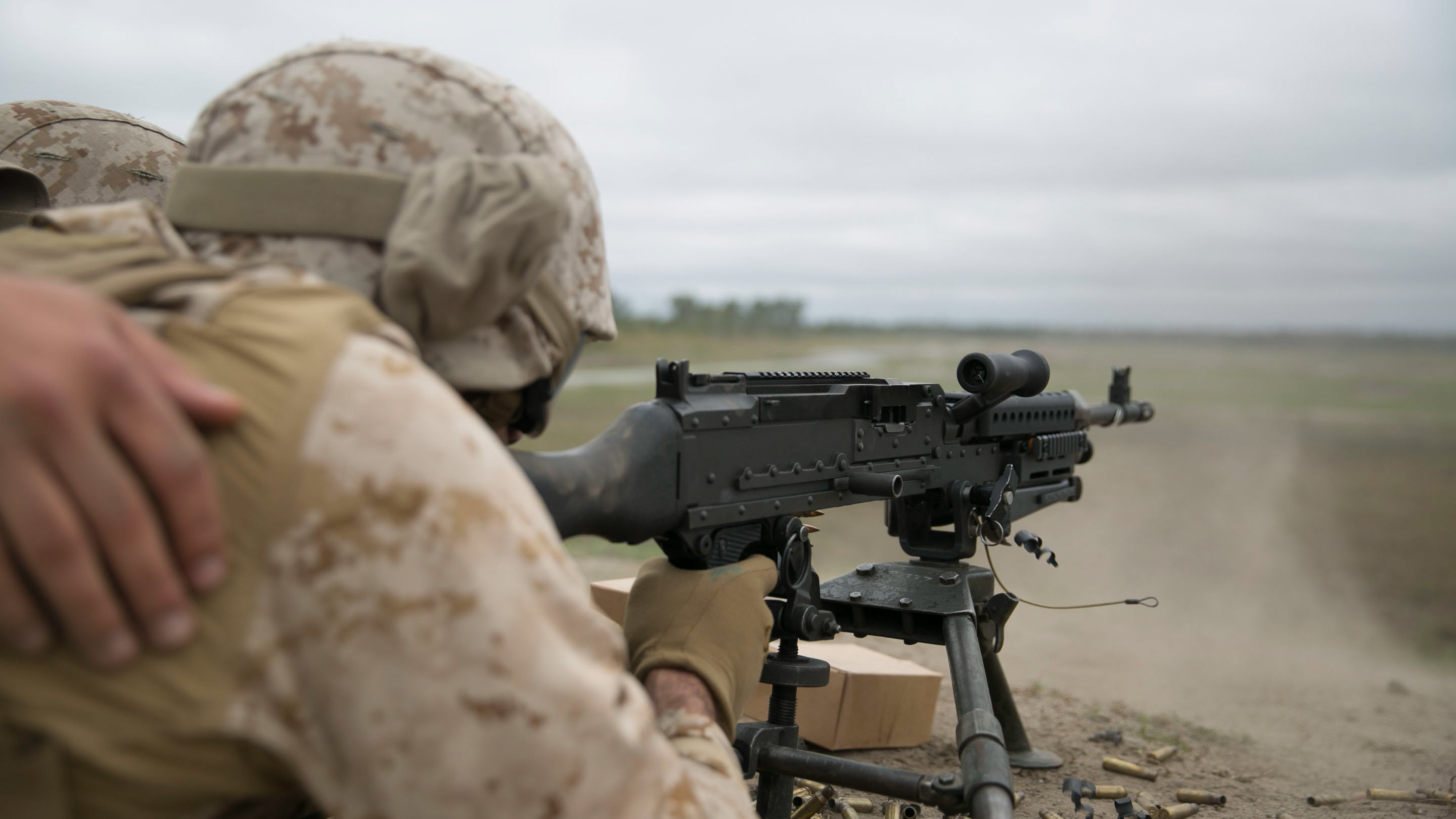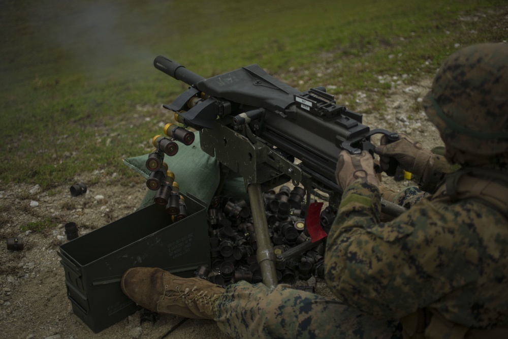 A Marine fires an M240 Bravo medium machine gun during a live-fire training exercise at a multipurpose machine gun range at Marine Corps Base Camp Lejeune, North Carolina