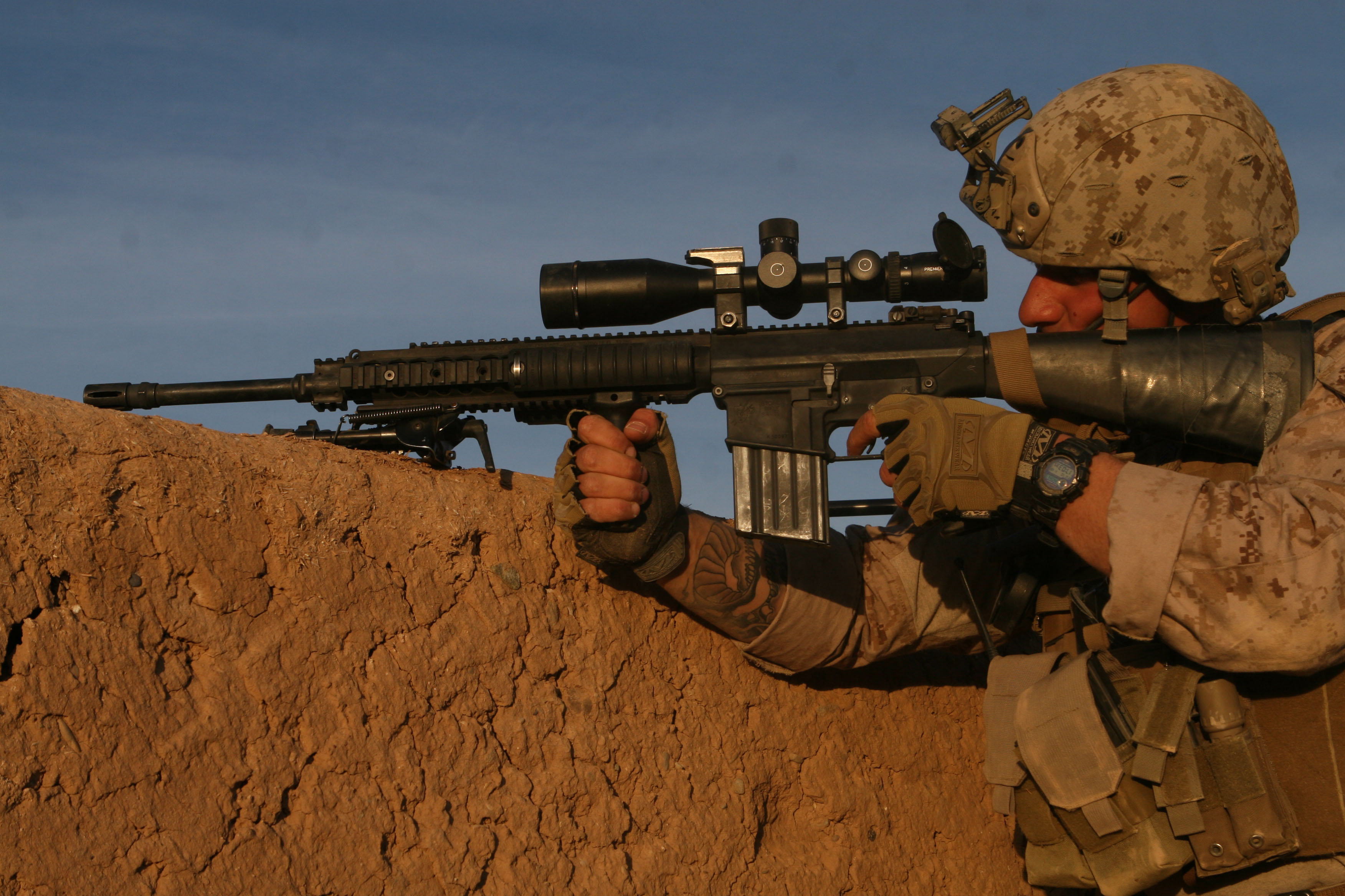 A sniper attached to Alpha Company, 1st Battalion, 6th Marine Regiment takes aim at insurgents from behind cover, during a firefight in Helmand province. Patrols have been increased in an effort to push the Taliban back and create a buffer for villages friendly towards coalition forces in the region.