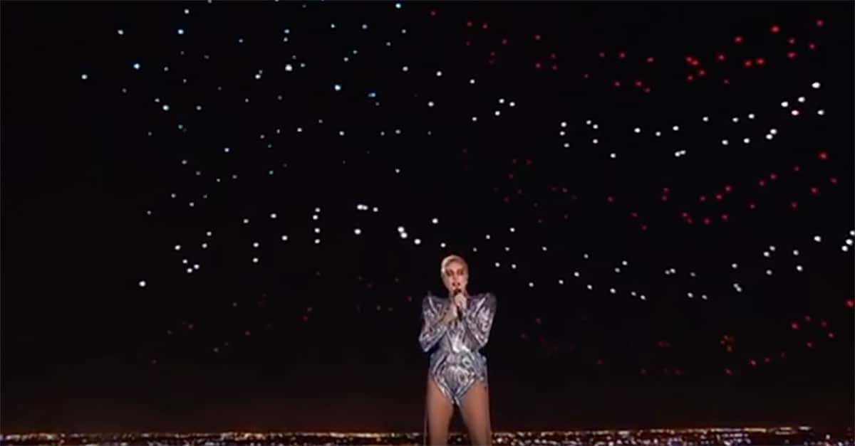 During Gaga’s show, 300 specially-built drones illuminated with colored LEDs created a pattern of an American flag and a Pepsi logo in the sky above Houston’s NRG Stadium. Dubbed “Shooting Stars,” the drones were built by Intel for light shows and are programmed to fly into specific patterns.