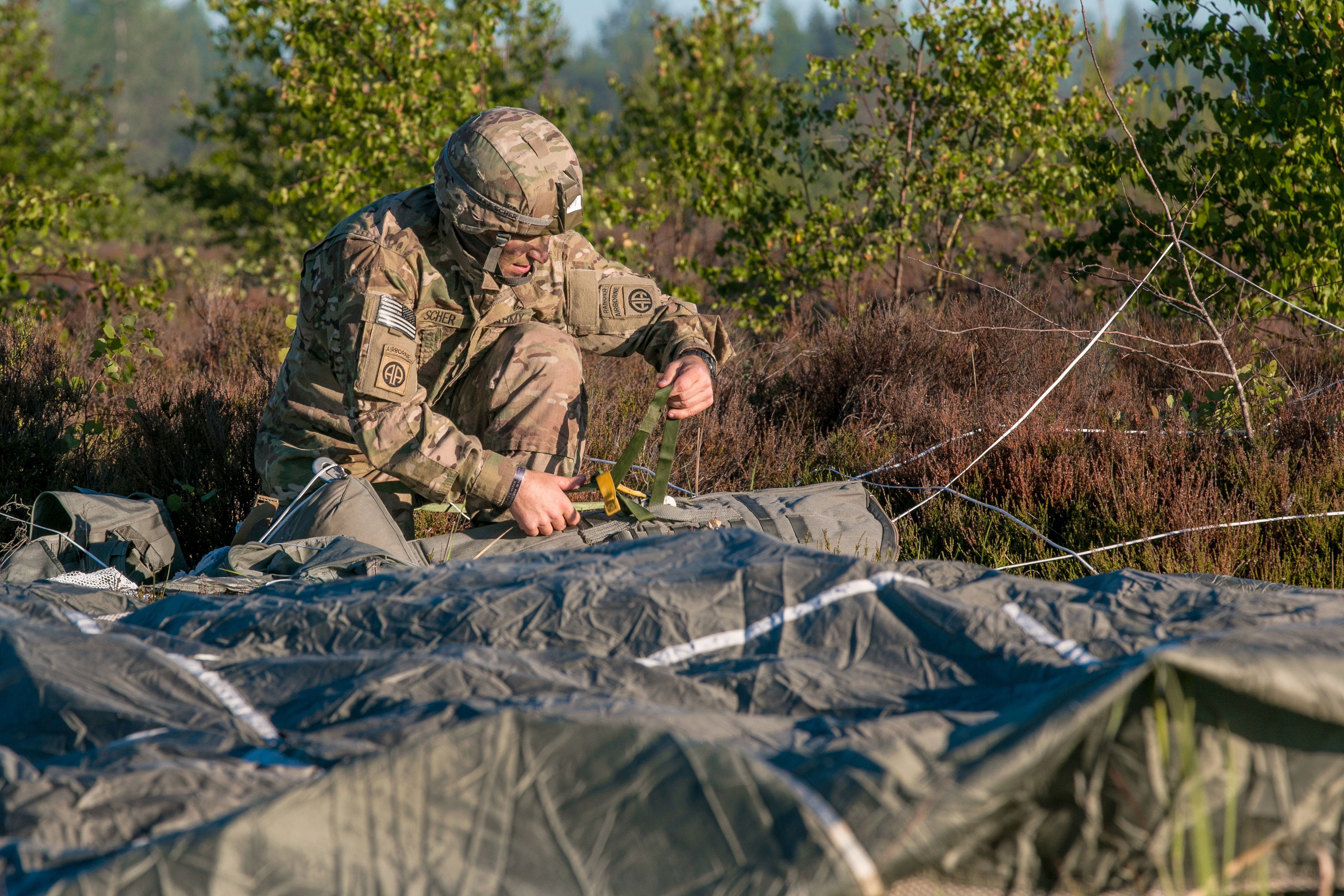A paratrooper gathers his equipment after making a landing during Saber Strike 2018.