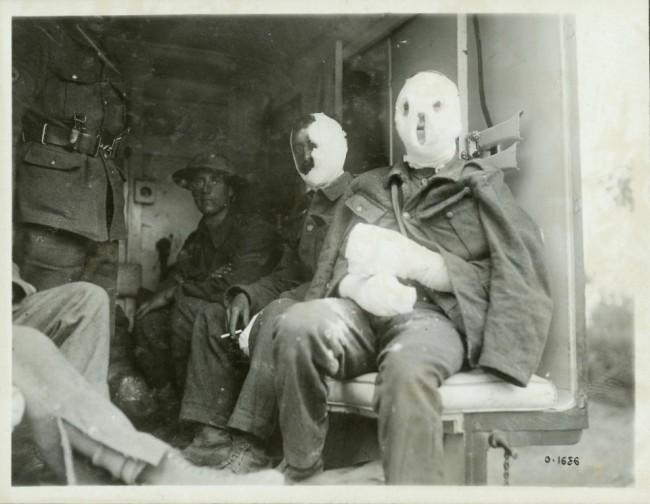 Mustard gas was first used in battle by the Germans in World War I with the expressed intent of demoralizing the enemy rather than kill him. The skin of victims of mustard gas blistered, their eyes became very sore and they began to vomit. Mustard gas caused internal and external bleeding and attacked the bronchial tubes, stripping off the mucous membrane. This was extremely painful. Fatally injured victims sometimes took four or five weeks to die of mustard gas exposure. (Source: Wikipedia)