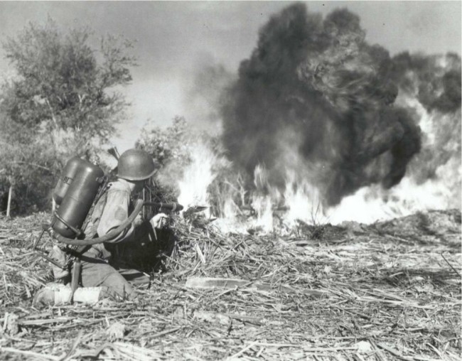 What do you do when you don’t want to crawl into tunnels and pull Japanese soldiers out of their hiding places one-by-one? You strap on your flamethrower and burn them out — a torturous way to go.