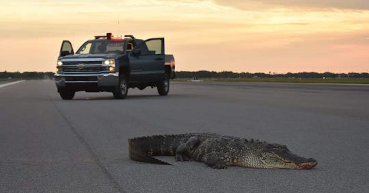 Officials at MacDill Air Force Base in Tampa Bay, Florida reported an unusual obstruction on the airstrip this past Tuesday preventing military aircraft from taking off: a laid back alligator seemingly perfectly content to catch some sun on the warm blacktop of the runway.