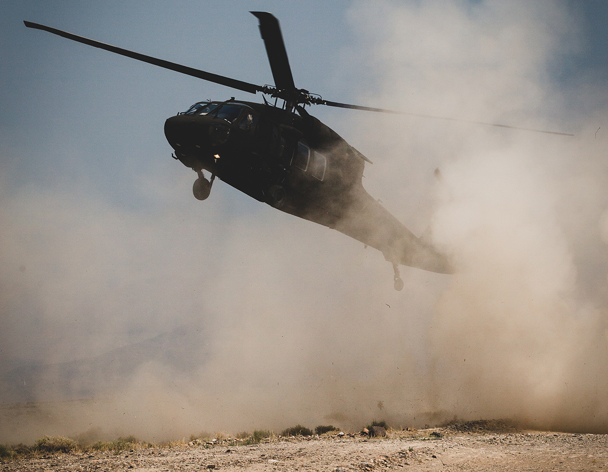 A U.S. Army National Guard UH-60 Blackhawk helicopter lands during training with U.S. Marines.