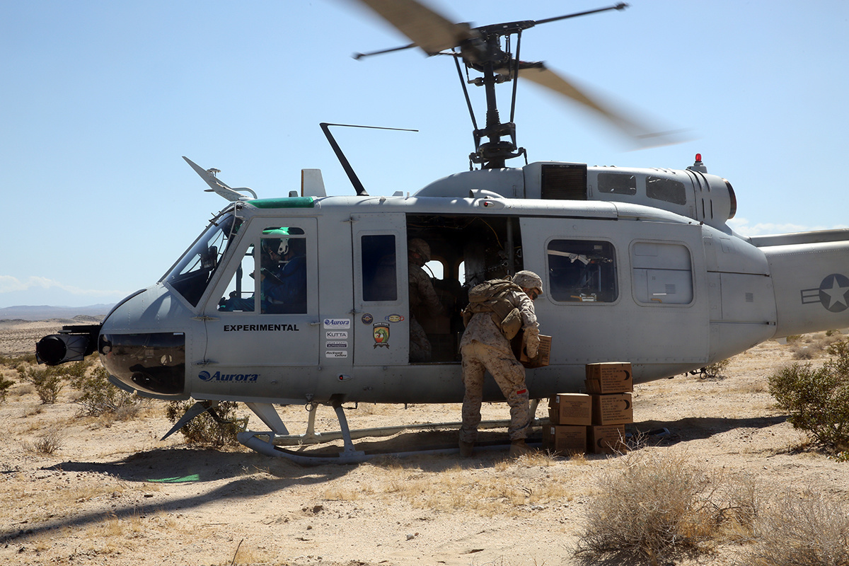An optionally piloted UH-1H helicopter drops off supplies during a May 2018 exercise at Twentynine Palms, California.