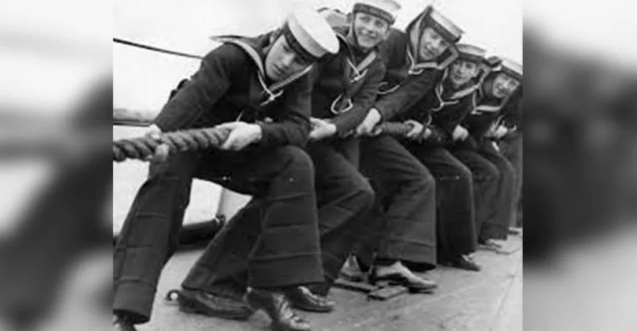 The U.S. Navy had been sporting the flared cuffs on its work uniforms since 1817. The idea was that sailors who would be working on the topmost decks, who were presumably swabbing it or whatever sailors did up there back then, would want to roll their pants up to keep them from getting wet or dirty. Sailors were also able to get out of their uniforms faster in the event that they had to abandon ship for some reason.