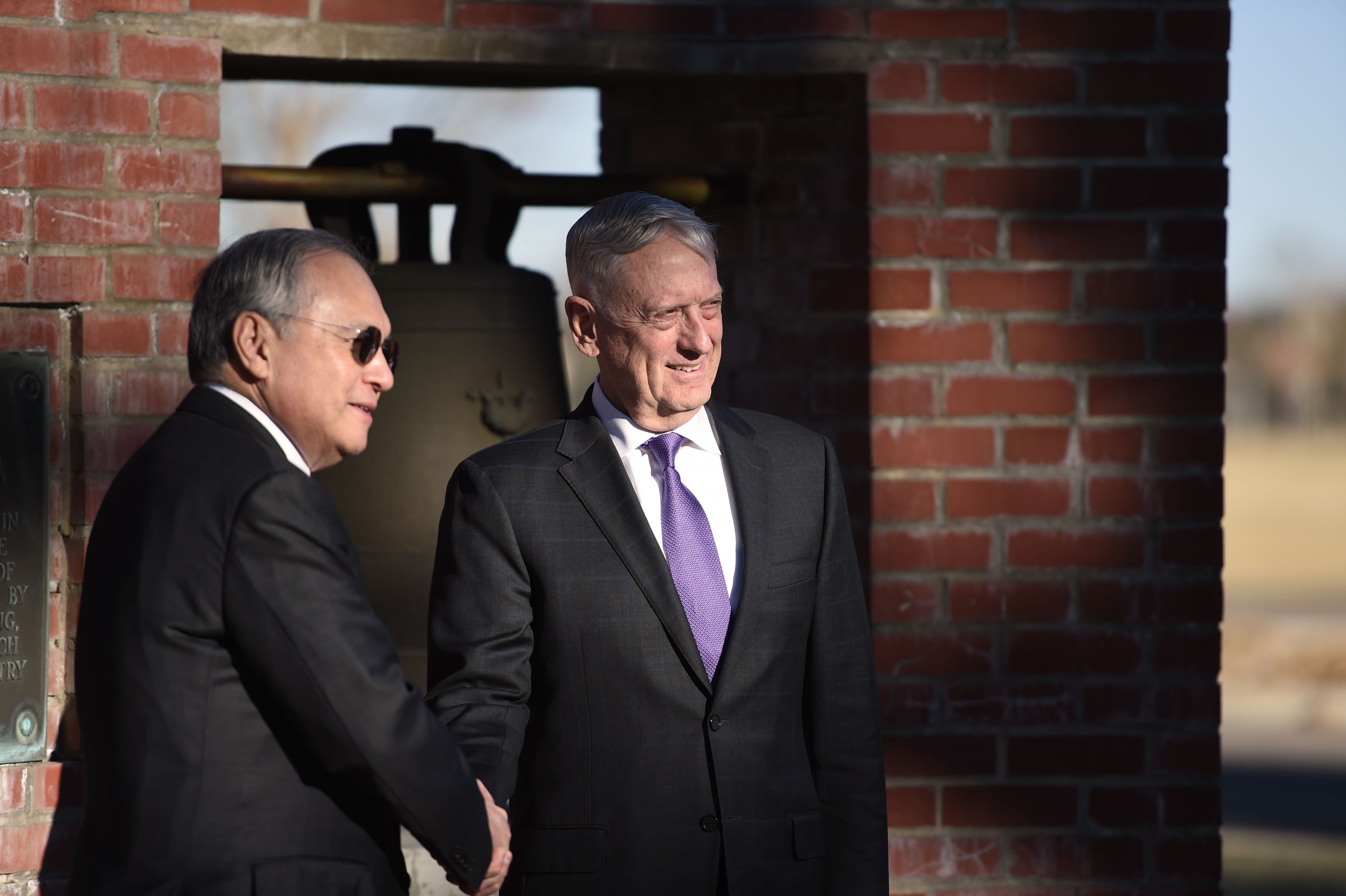 James Mattis and Philippines Ambassador Jose Manuel G. Romualdez shake hands in front of the Bells of Balangiga display at F.E. Warren Air Force Base in Cheyenne, Nov. 14, 2018. The ceremony in Wyoming signaled the start of an effort to return the bells to the Philippines.