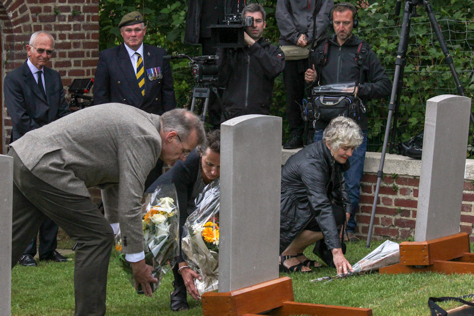 Family members of Pvts. Paul Mead and Chris Mead lay flowers on their family members’ graves during a ceremony in France in June 2019.