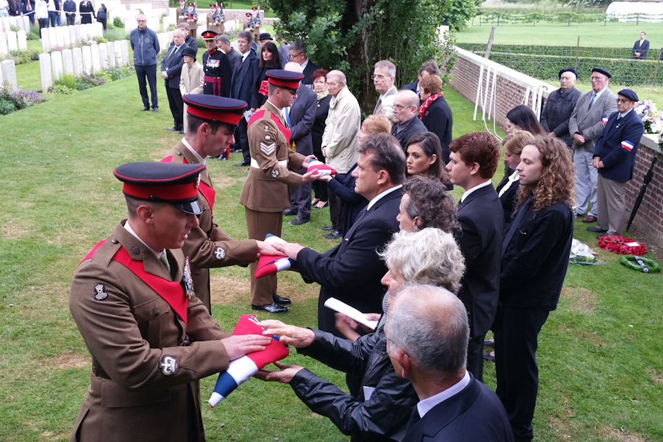 So the JCCC organized a funeral for the men at the Hermies Hill British Cemetery near Cambrai, France, just a few miles from where the remains were originally found at Anneux, France. The ceremony was held with full military honors provided by the 23rd Battalion, London Regiment. The deceased soldiers had served in an earlier version of the London Regiment that was disbanded in 1938.