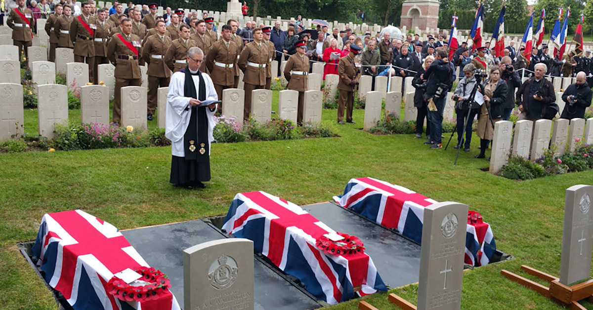 So the JCCC organized a funeral for the men at the Hermies Hill British Cemetery near Cambrai, France, just a few miles from where the remains were originally found at Anneux, France. The ceremony was held with full military honors provided by the 23rd Battalion, London Regiment. The deceased soldiers had served in an earlier version of the London Regiment that was disbanded in 1938.