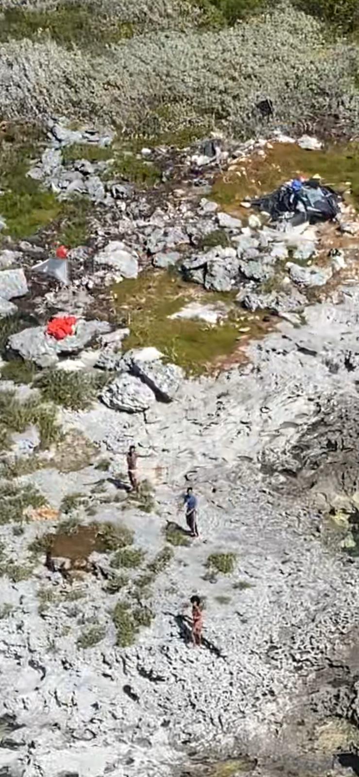 Three people are stranded with a makeshift shelter on Anguilla Cay, Bahamas, Feb. 8, 2021. A Coast Guard Air Station Clearwater MH-60 helicopter crew hoisted the two men and one woman and transferred them to Lower Keys Medical Center with no reported injuries. Coast Guard Photo by Lt. Riley Beecher.