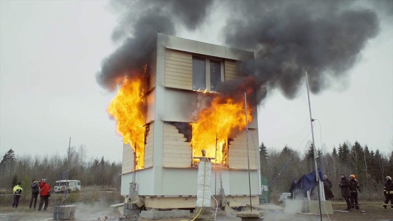 Believe it or not, this is a passing fire test. Cross-laminated timber passed the test for fire resistance, but organizers were a little disappointed that it never self-extinguished. It was hoped that as the wood charred, which greatly reduces its flammability, the flame would run out of fuel.