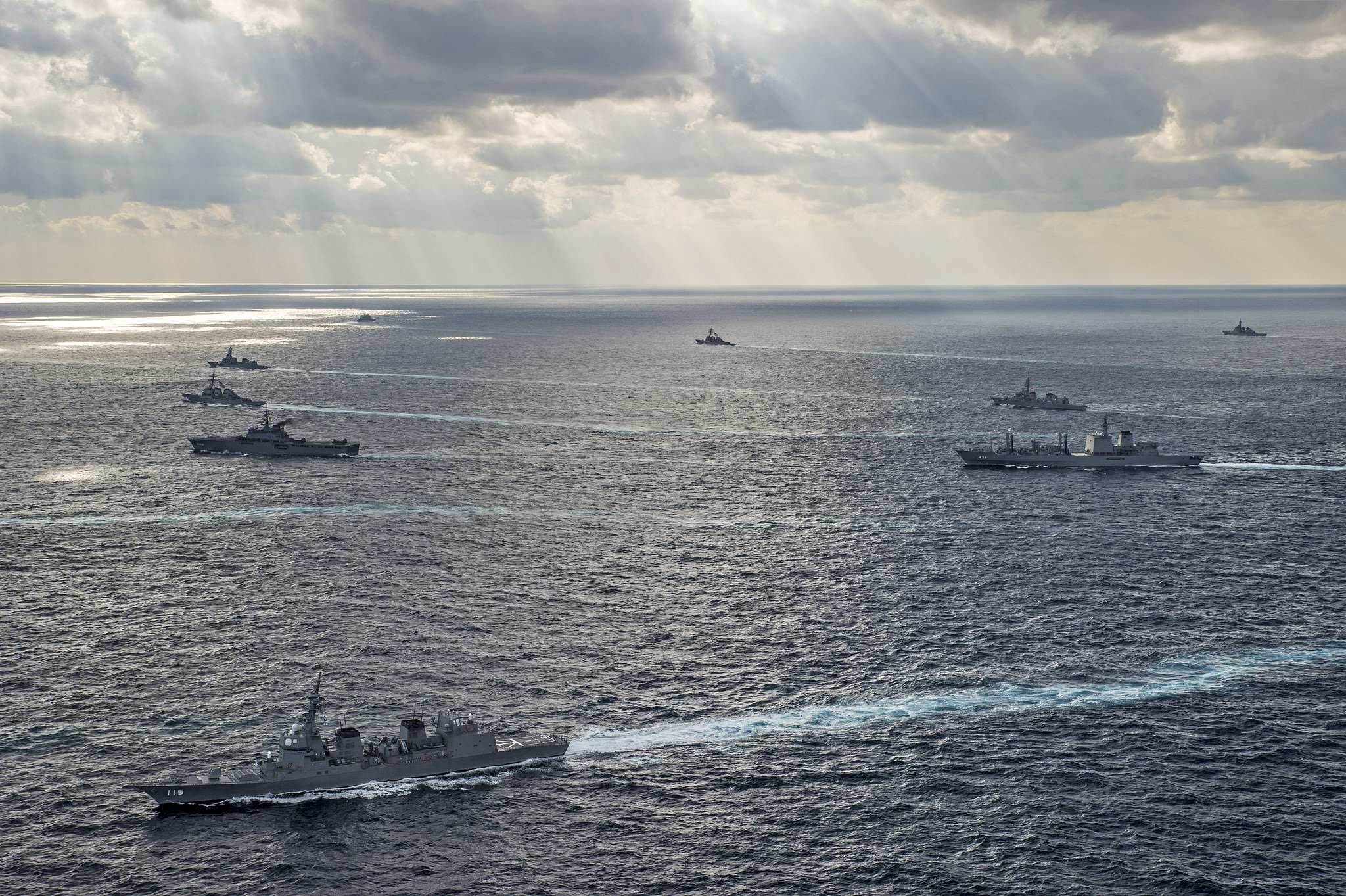 U.S. Navy and Japan Maritime Self-Defense Force ships are underway in formation during Keen Sword 15.