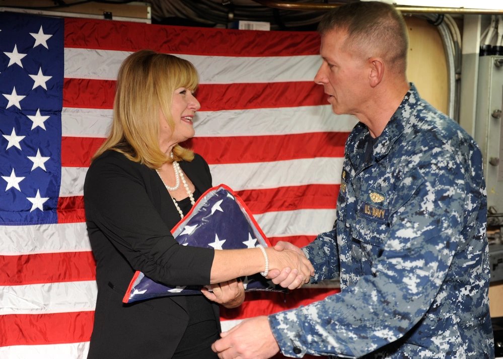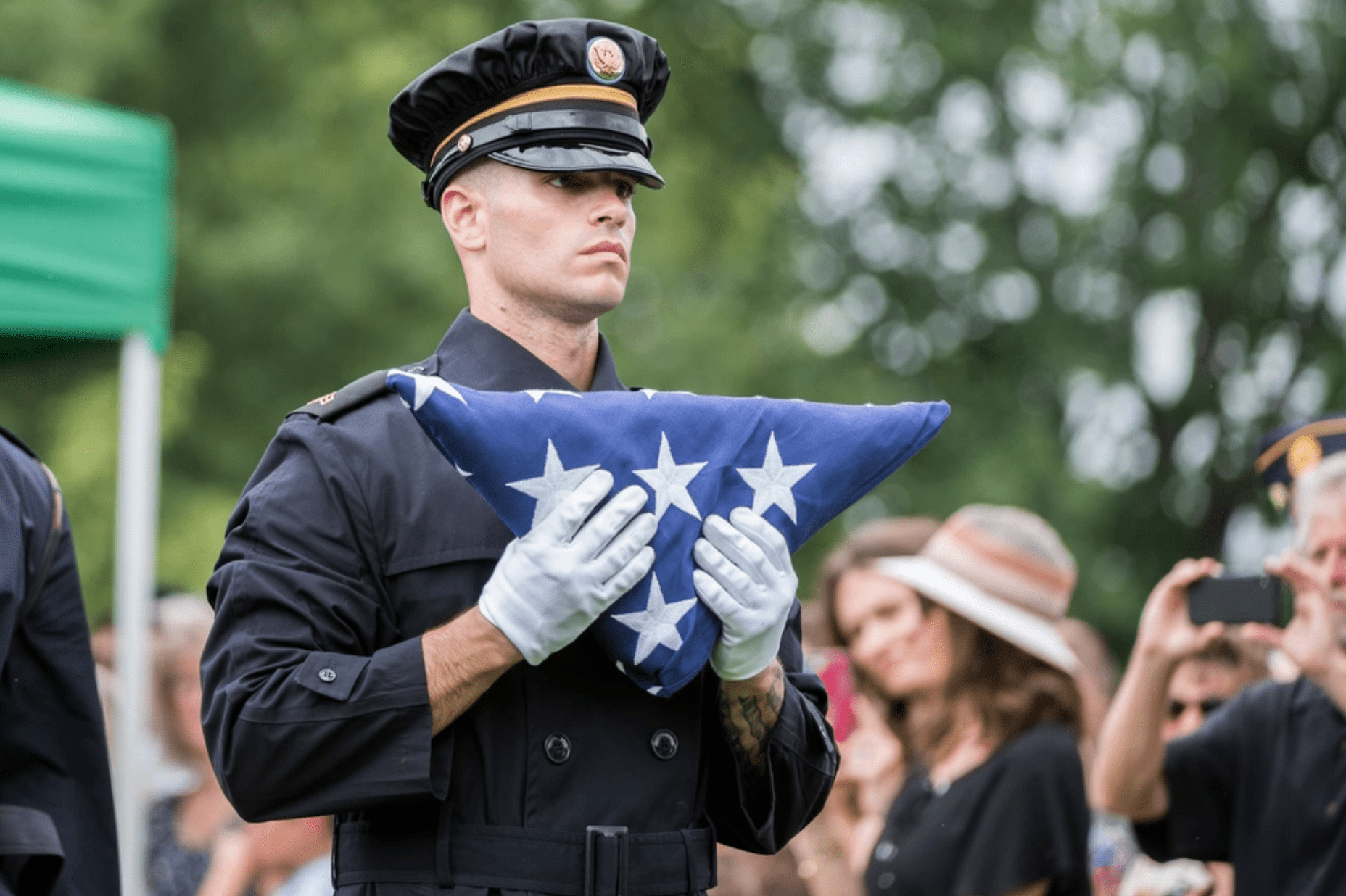 During the funeral service of the fallen military member, senior officers present the Gold Star Pin in addition to the national colors to the spouse or next of kin as a mark of respect for their sacrifice.