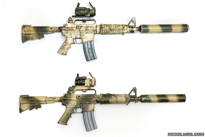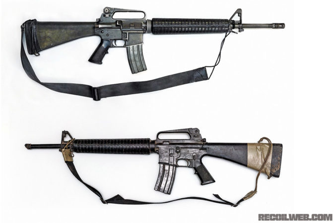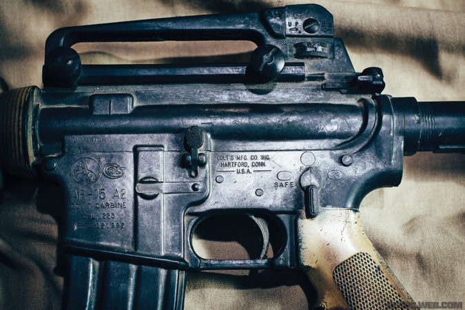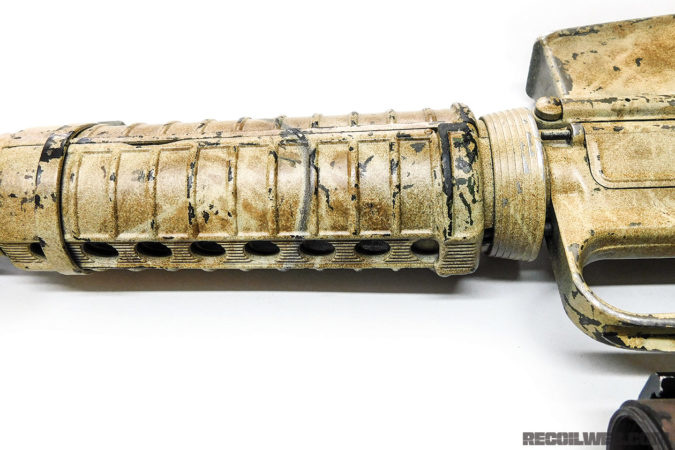 The rubber dummy prop M16 shows the on-screen configuration for Ranger M16s. Although the dummy’s M16A1 “slab side” lower is slightly different than the blank-firing prop — cast from a civilian Colt HBAR Sporter — it’s similar enough to pass unnoticed to most viewers.