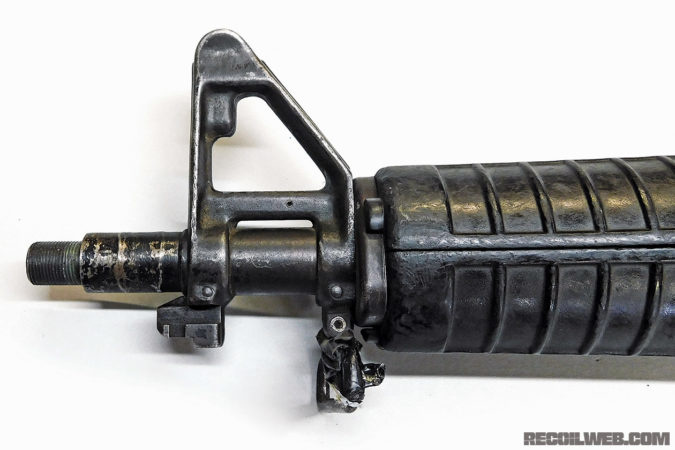 Most CAR-15 rifles were modified M16A2 rifles. This barrel was cut to approximately 10 inches and the front sight post was moved back to accommodate the modified handguards, while retaining the traditional triangular M16A2 handguard cap.