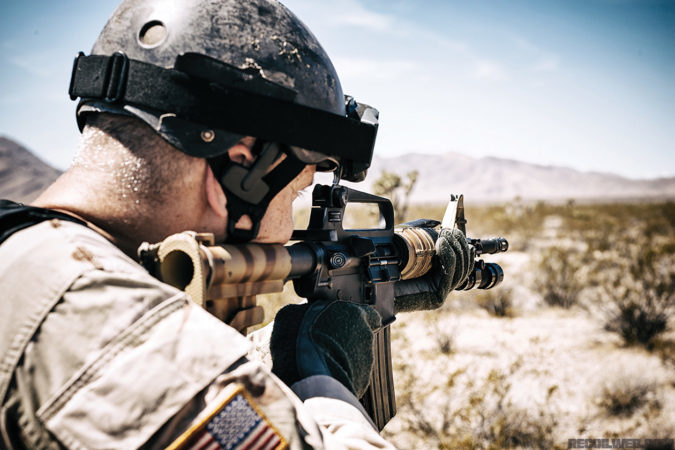 This CAR-15, manufactured by Enhanced Tactical Arms in Las Vegas, Nevada, is a replica of the on-screen prop representing Master Sergeant Gary Gordon’s CAR-15 — a replica of a replica, as it were. These images were Photoshopped to represent the rifle in its Class III configuration. The replica is fitted with an Aimpoint CompM red dot optic.