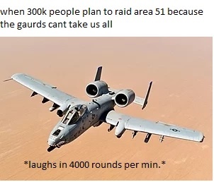 This one is my absolute favorite, because, despite my allegiance to the internet’s tomfoolery (it is, after all, how I make a living), I’m still every bit the salty old platoon sergeant I once was, deep beneath my softening midsection. As I’ve seen this meme fad develop into a news story, and that story mobilize people into thinking an actual raid is possible, part of me sort of wants to see a mob of entitled young adults storming across the dry sands of Groom Lake.