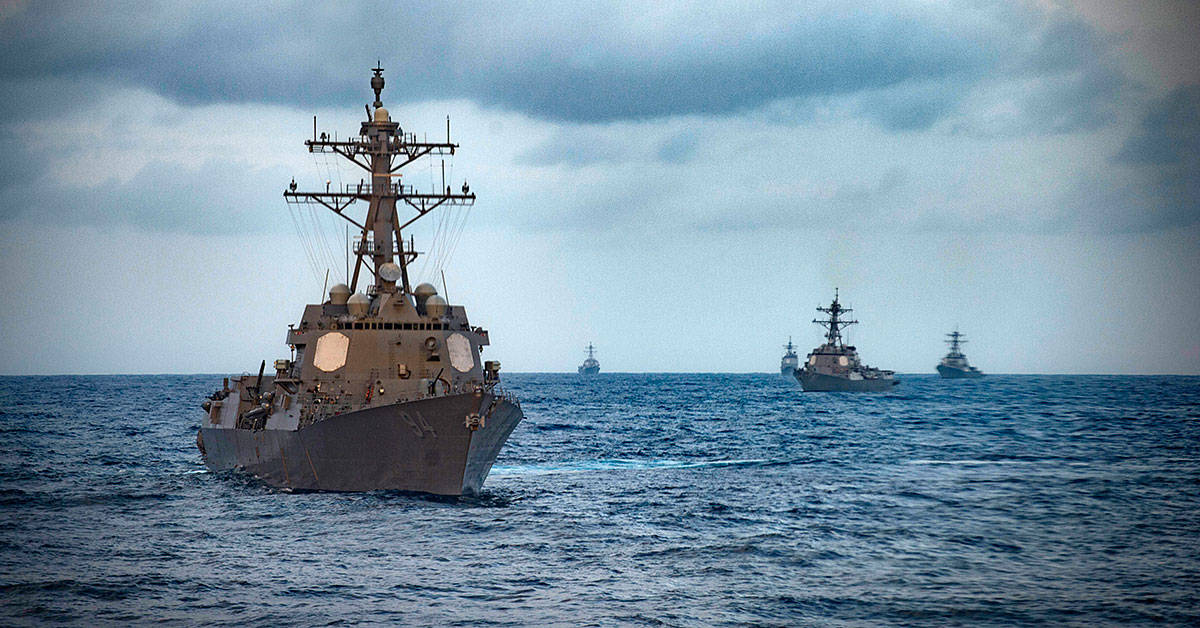 Guided-missile destroyer USS Nitze (DDG 94), front, steams in formation with USS Stout (DDG 55), USS Mason (DDG 87), USS Monterey (CG 61) and USS Roosevelt (DDG 80). The Mason and Nitze have been involved in three missile ambushes by Iran-backed Houthi rebels off the coast of Yemen in recent weeks. (U.S. Navy photo by Mass Communication Specialist 3rd Class Ryan U. Kledzik/Released)