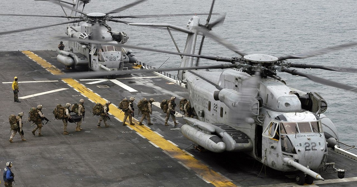 According to MilitaryFactory.com, the CH-53E is a heavy-lift cargo helicopter capable of carrying up to 55 troops. It has a top speed of 195 miles per hour and a range of up to 1,140 miles. It is capable of being refueled in midair by tankers like the KC-130. For self-defense it carries chaff and flare dispensers to defeat enemy missiles, and it has three ,50-caliber machine guns.