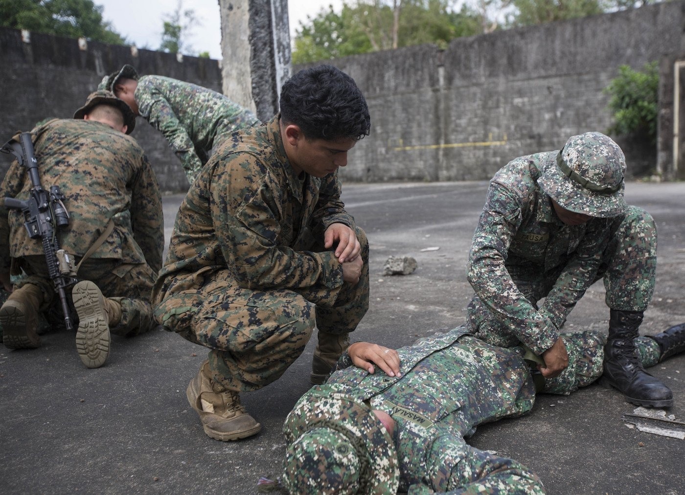 US Marine Corps Lance Cpl. Jovanny Rios guides a Philippine marine in a combat life-saver drill during KAMANDAG 2, in the Naval Education Training Center, Zambales, Philippines, Oct. 2, 2018.