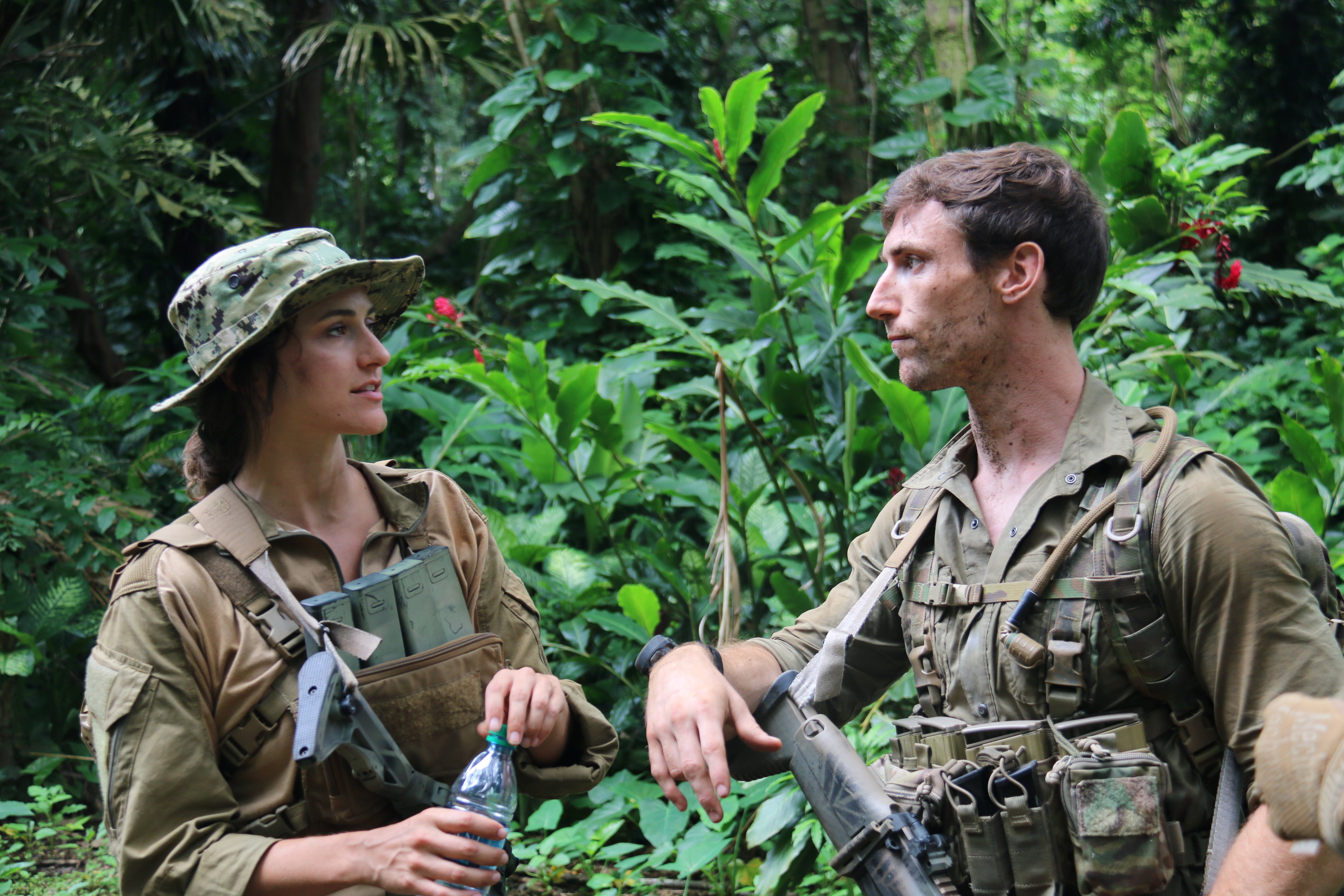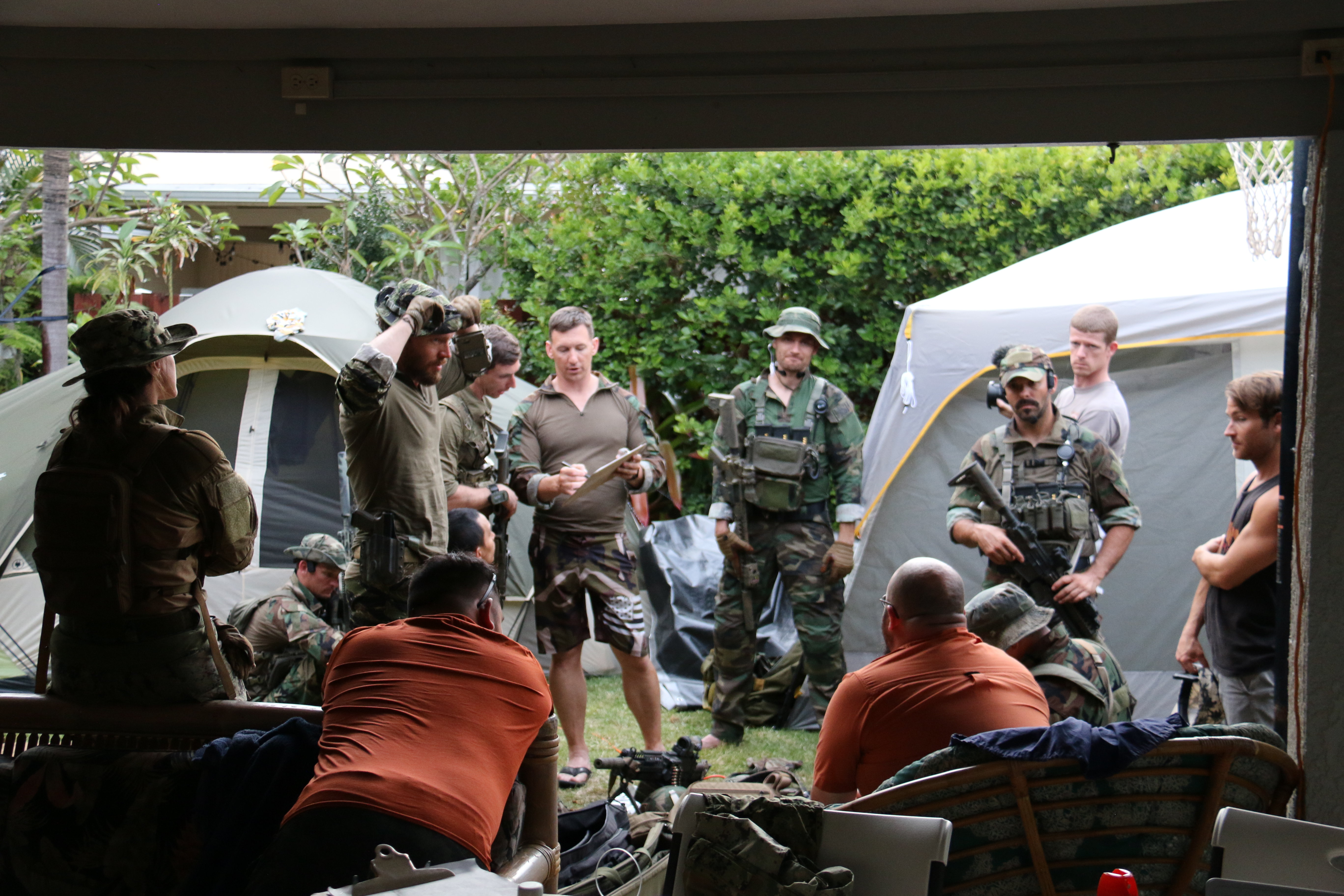 The cast and crew had 5 days to get every shot they needed on the island. Like any indie filmmakers could attest, it meant a brutal schedule. Dogs of War helped with three locations and active duty service members stationed on the island helped transport cast and crew — and jumped in for stunts and background work.
