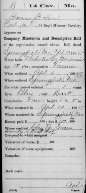 James Bolin served as a Private in the Union Army, in the 14th Missouri Cavalry with F Company. He enlisted in the Union when he was just 18 years old on April 6, 1865. He married after the war and went on to have a daughter. When Bolin’s wife passed away in 1922 he found himself alone and unwell.