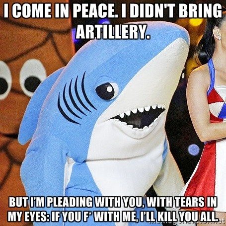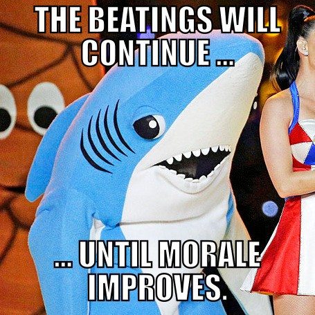 Sgt. Left Shark wants good morale, and he will have it by any means necessary.