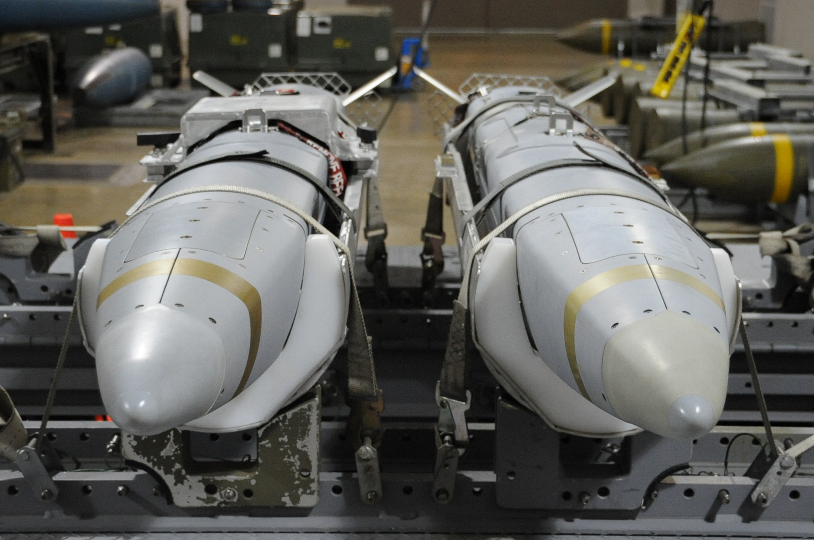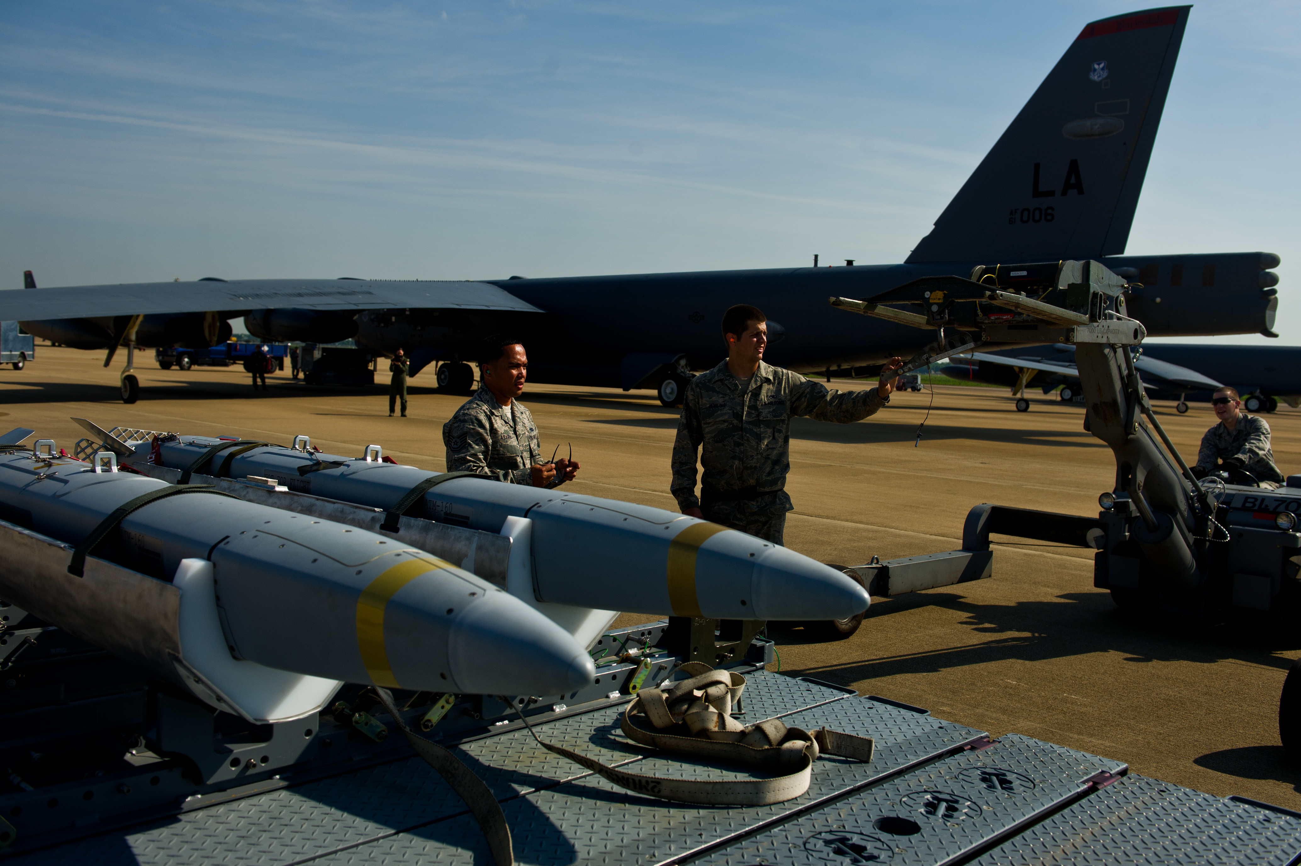 Two Miniature Air-Launched Decoy missiles wait to be loaded onto a B-52H Stratofortress at Barksdale Air Force Base, Louisiana, Ma 14, 2012. The B-52H crew can communicate with the missiles in flight and change the flight patterns to engage newly discovered enemy air defenses.