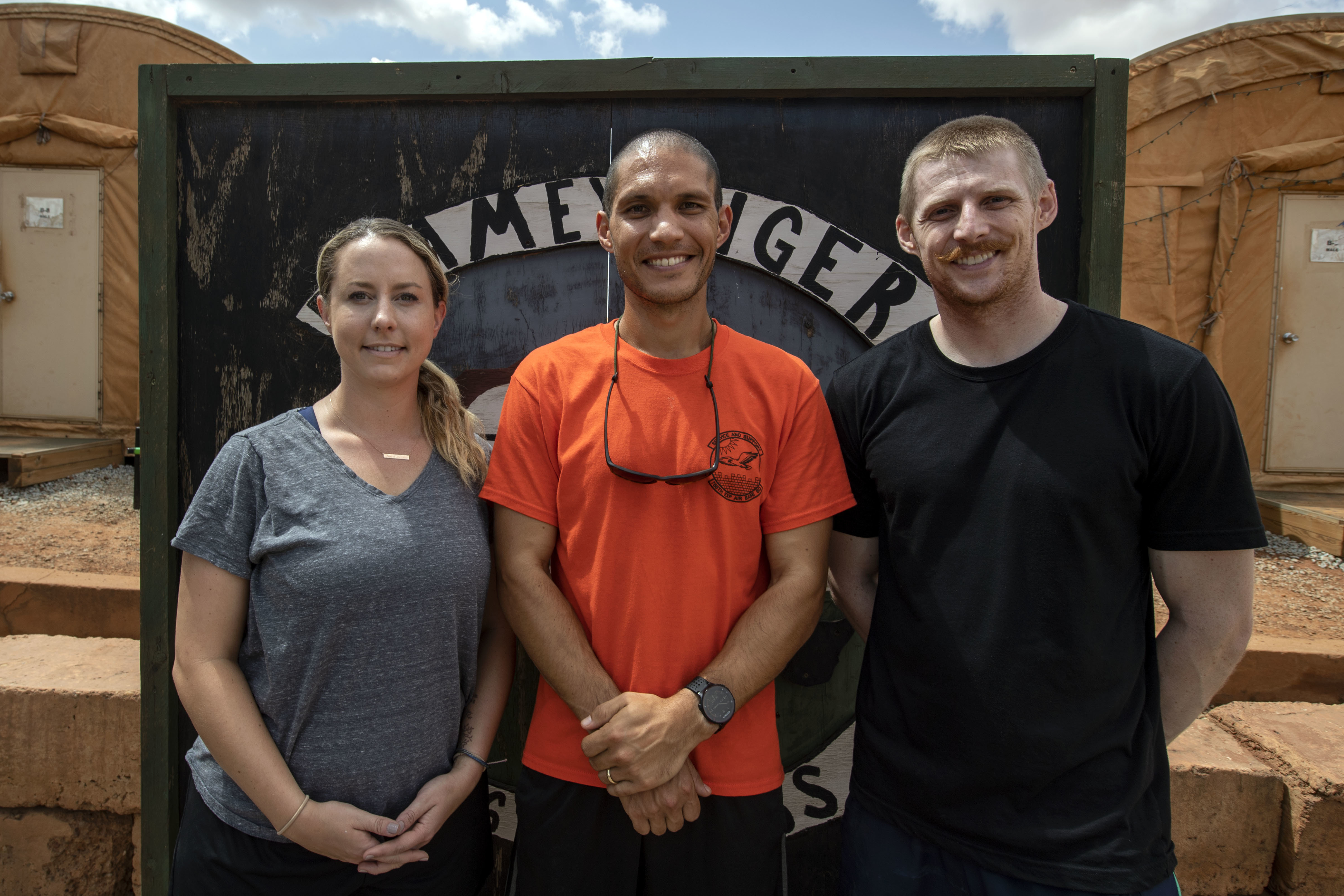 Three doctors, U.S. Air Force Capts. Melanie Gates, left, Nick McKenzie, and Richard Thorsted, all with Special Operations Command Forward — Northwest Africa ground surgical team, gather for a photo at Nigerien Air Base 101, Niamey, Niger, on June 21, 2018. The doctors were all involved in an emergency surgery which successfully saved the life of an injured Italian woman.