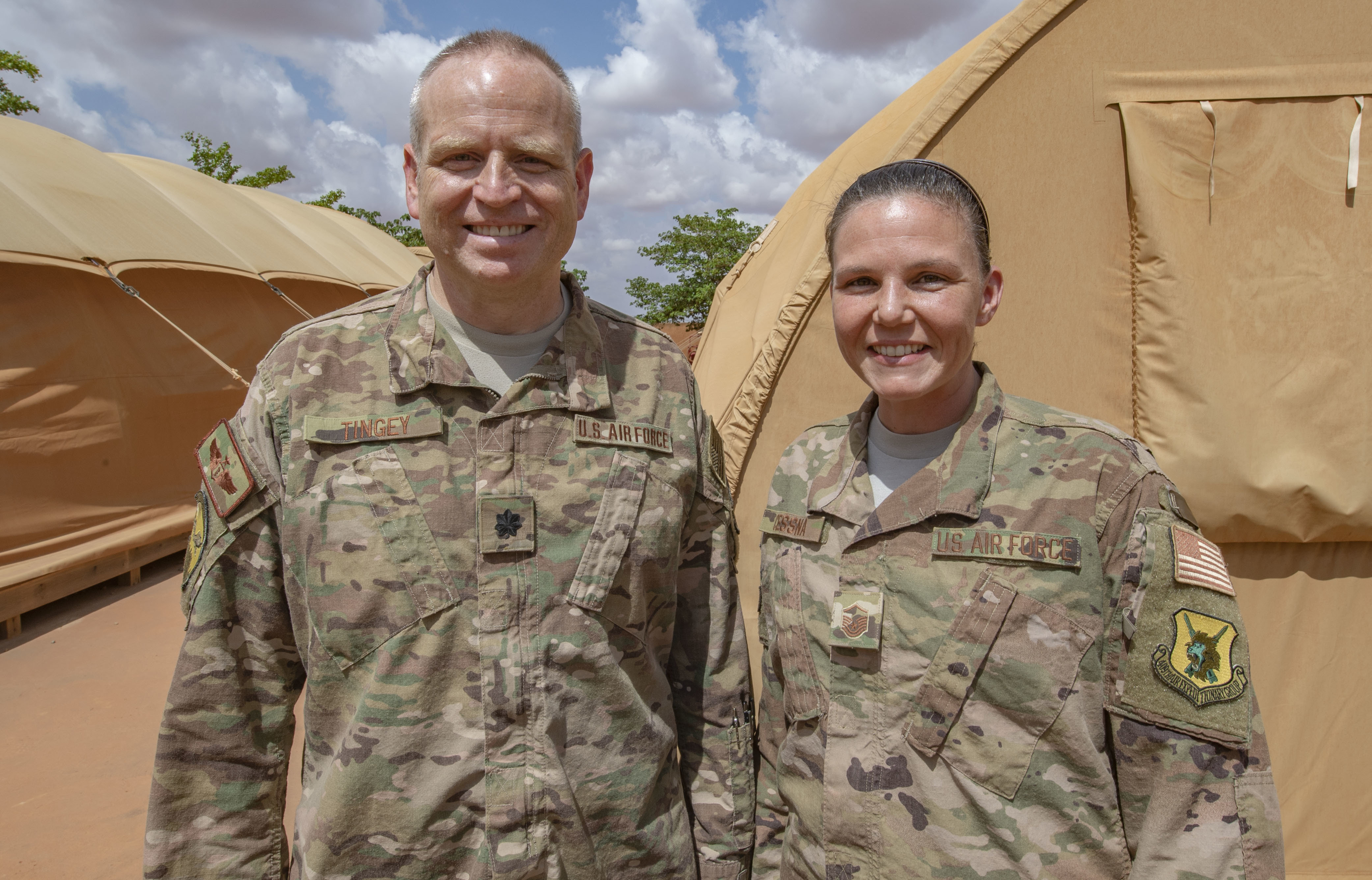 Lt. Col. Justin Tingey, 768th Expeditionary Air Base Squadron flight doctor, and Master Sgt. Melissa Cessna, 768th EABS independent duty medical technician, pose for a photo at Nigerien Air Base 101, Niamey, Niger, on June 21, 2018. The team recently set up a walking blood bank to enable life-saving surgery to an Italian woman who nearly died in a car accident outside the base. The patient is now in good condition and recovering in Italy.