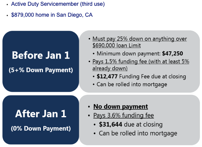 Jeff Jabbora is a Marine veteran who has spent the last seven years as a real estate agent in San Diego County. When asked about the new law, he said the new law “enables qualified veterans, who qualify for a loan amount over the local area maximum to be able to not have to put money down on the loan. For example, if the local/county loan limit for where the veteran is buying the home was 0k, and the veteran was buying a 0k property, with the previous program, the veteran buyer would need to bring money to the table on the overage. Most often, 25 percent. So in that scenario, it would be 25 percent of the overage of, 0k, which would be k.”