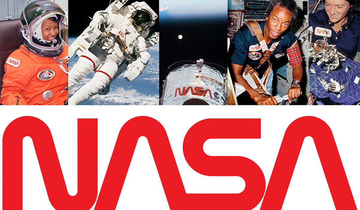 Sightings of the NASA logotype (the “worm”), from left: Astronaut Mae Jemison preparing for launch; astronaut Bruce McCandless on an untethered spacewalk; the Hubble Space Telescope; astronaut Guy Bluford; and astronaut Sally Ride.