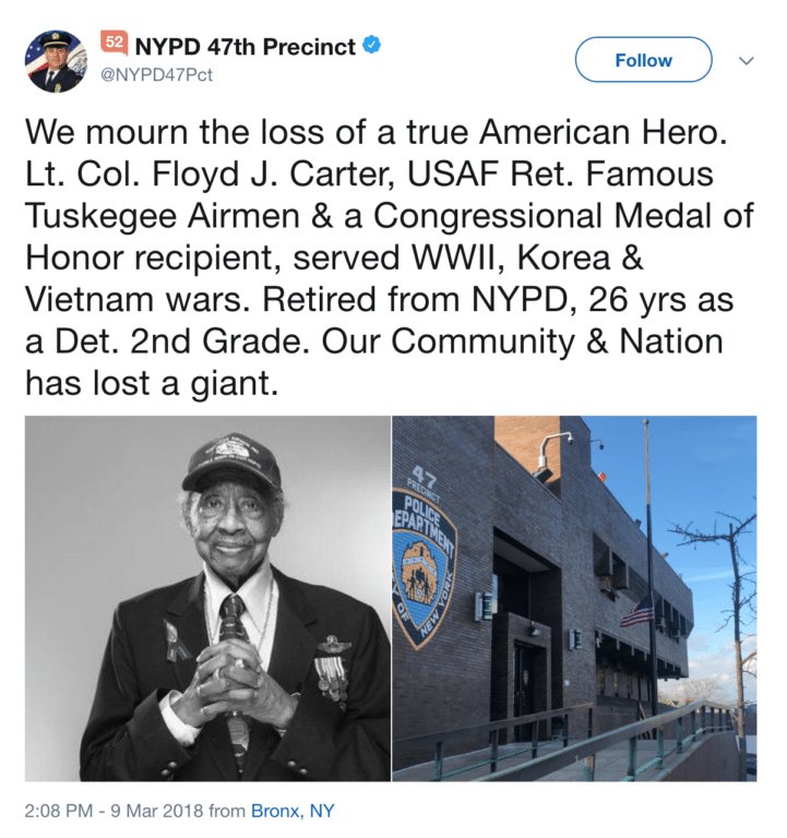 Carter was presented with a Congressional Gold Medal from then-President George W. Bush in 2007. He and other Tuskegee Airmen were also invited to President Barack Obama’s 2009 Inauguration ceremony as well as the premiere of George Lucas’ 2012 film about the Tuskegee Airmen, Red Tails.