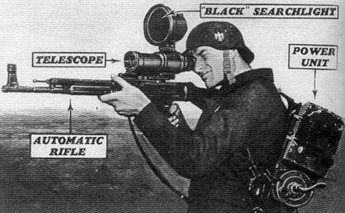 A German soldier holding a “Zielgerät 1229” night-vision scope, attached to his rifle.